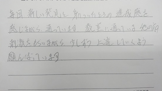 「毎回、新しい発見と身についたときの達成感を感じながら、通っています。教室に通っている他の方の刺激をもらいながら、少しずつ上達していくよう頑張っています。」